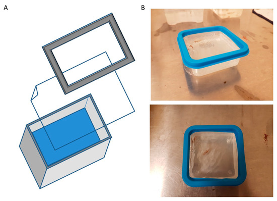 Fish microgravity box. (A) A commercial food-grade polyethylene square box (10 cm × 10 cm × 4 cm) was used adding a gas permeable transparent film on top, sealed with cut cover. ((B) upper and lower). The box was filled with E3 medium and used during the experiment to house a single adult fish.