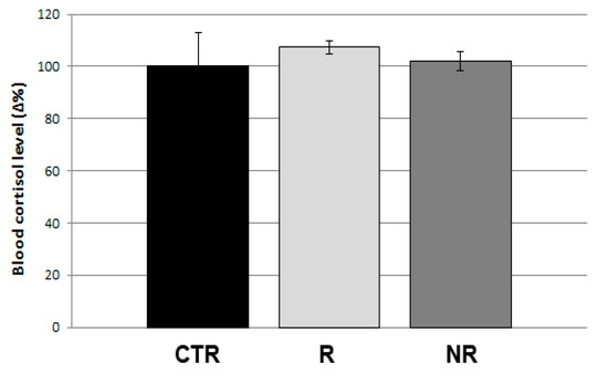 Cortisol evaluation. Cortisol level in blood of controls (CTR), rotating (R) and non-rotating (NR) fish. No modulation was highlighted (n = 3 fish for each group).