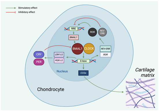 Molecular machinery of the circadian clock in chondrocytes. The circadian oscillator consists of two interconnected TTFLs. In the core loop, the CLOCK/BMAL1 heterodimer induces E-box-mediated transcription of PER and CRY, the negative regulators. PER and CRY proteins, in turn, repress E-box-mediated transcription. CLOCK and BMAL1 also control the expression of RORs and REV-ERB in the auxiliary loop, which modulate BMAL1 mRNA levels. The rhythmic activity of the clock components also determines the expression of clock-controlled genes (CCGs). Green lines indicate stimulatory (positive), whereas red lines indicate inhibitory (negative) effects. See abbreviations in text. Created with BioRender.com.