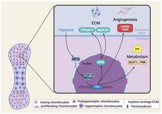 In response to hypoxia, HIF-1 triggers metabolic adaptions in the cell, including the increased expression of glucose transporters and glycolytic enzymes. Genes with various roles in apoptosis, cell proliferation, angiogenesis, and erythropoiesis are also activated by HIF-1α [45,46,47]. At the same time, HIF-1α has essential roles in numerous physiological and pathological cell processes like tumorigenesis, inflammation, and tissue development including chondrogenesis [41]. In addition to the most well-known factors that affect cartilage development, such as TGF-β, Wnt, SOX5, SOX6, and SOX9 [48,49], HIF-1α also has a pivotal role in chondrogenesis, by linking chondrocyte cell cycle with hypoxic conditions [50].