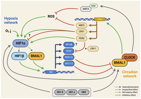 As the previous findings suggested, there is an approximately 30–50% overlap among HIF-1α and BMAL1 target genes [64]. In addition, the BMAL1/HIF-1α heterodimer also stimulates Per2 transcription in C2C12 myoblasts, further reinforcing the connection between the circadian and hypoxia-related networks. Interestingly, in embryonic stem cells, BMAL1/HIF-1α complexes could not be observed [73]. In macrophages, the BMAL1/CLOCK heterodimer induces NRF2 transcription factor expression, which suppresses reactive oxygen species (ROS), and therefore HIF1-α, and thus dampens the production of the proinflammatory cytokines IL-1β and IL-6 [74,75,76]. Notably, NRF2 does not appear to be regulated by circadian clock proteins in all tissues, for instance, in the cerebral cortex [77]. Another possible bridge in the intertwined relationship between the molecular clock and hypoxia is the sirtuin protein family, which are NAD+-dependent deacetylases. The co-factor of SIRT3 is under circadian control, and the absence of SIRT3 in mitochondria increases ROS levels, resulting in HIF1-α stabilization in SIRT3 KO HEK293T and MEF cells [78]. When HEK293 and MEF cells were exposed to a weak-pulsed electromagnetic field, this elevated ROS production due to changes in the expression of CRY [79]. Another interesting link is via casein kinases (CK1 δ/ε, CK2). In hypoxic conditions, they can post-translationally modify BMAL1 in hamster SCN cells, and in HEK293 and MEF cells [80,81], and HIF-1α in HeLa cells [82], which may strengthen the interconnection between circadian and hypoxic regulation.
