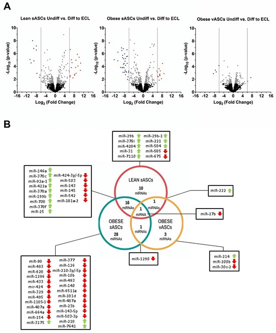 Figure 2. Differentiation into ECL cells modifies the miRNA profile of ASCs (nine days in culture with DMEM supplemented with bFGF). (A) Volcano plots of differentially expressed miRNAs in sASCs from lean donors and sASCs and vASCs from the same obese individual differentiated into ECL cells with a significance threshold of ±6-fold (p-value < 0.05). (B) Venn diagram showing the number of miRNAs differentially expressed in ASCs differentiated into ECL cells.