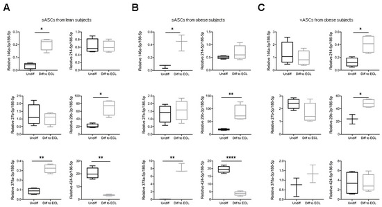 Different miRNAs were validated by qRT-PCR analysis. In sASCs differentiated into ECL cells from both lean and obese subjects, the same miRNAs were validated. MiRNA-146-5p (p-value < 0.05), miRNA-29b-3p (p-value < 0.05), and miRNA-378a-3p (p-value < 0.01 and p-value < 0.001) showed an increase, whereas miRNA-424-5p was downregulated (p-value < 0.01 and p-value < 0.0001, respectively (Figure 3A,B). On the other hand, in ECL cells from vASCs of obese subjects, two miRNAs were validated. Both miRNAs, miRNA-214-5p and miRNA-29b-3p, were upregulated (p-value < 0.05) (Figure 3C). It is important to note that vASCs from obese subjects showed high variability between samples, which could be attributed to individual obesity metabolic effects.