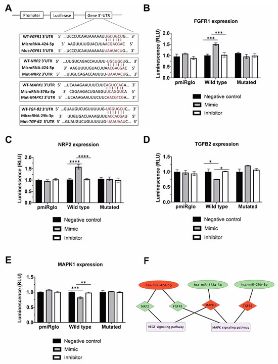 Figure 5. FGFR1, MAPK1, NRP2, and TGF-β2 are direct targets of miRNA-29b-3p, miRNA-378a-3p, and miRNA-424-5p. (A) Bioinformatics-based prediction of the miRNA-424-5p, miRNA-378a-3p, and miRNA-29b-3p target sites in the 3′-UTR of FGFR1, MAPK1, NRP2, and TGF-β2 mRNA. Red letters indicate the mutated sites in the miRNA seed region. (B) Relative luciferase activities 36 h after cotransfection of HeLa cells with miRNA-424-5p mimic, inhibitor, or negative control, and a luciferase reporter vector containing the wild-type or mutated 3′-UTR of FGFR1. (C) Relative luciferase activities 36 h after cotransfection of HeLa cells with miRNA-424-5p mimic, inhibitor, or negative control, and a luciferase reporter vector containing the wild-type or mutated 3′-UTR of NRP2. (D) Relative luciferase activities 36 h after cotransfection of HeLa cells with miRNA-378a-3p mimic, inhibitor, or negative control, and a luciferase reporter vector containing the wild-type or mutated 3′-UTR of MAPK1. (E) Relative luciferase activities 36 h after cotransfection of HEK 293 cells with miRNA-29b-3p mimic, inhibitor, or negative control, and a luciferase reporter vector containing the wild-type or mutated 3′-UTR of TGF-β2. Results are shown as the arithmetic mean ± SD of three independent experiments, and statistical analysis was performed by ANOVA followed by Tukey’s post hoc test. * p-value < 0.05, ** p-value < 0.01, *** p-value < 0.001, and **** p-value < 0.0001 (n = 3). (F) Regulation of the angiogenic differentiation of ASCs. KEGG and PANTHER analysis predicted that the represented miRNAs are targeting the genes associated with the pathways, as shown using Cytoscape software v3.9.0. The miRNAs are shown in red (downregulated) or green ellipses (upregulated), with black lines indicating the targeted upregulated (green) or downregulated (red) genes represented in diamonds, and the pathways involved in the mechanism are depicted by purple nodes.