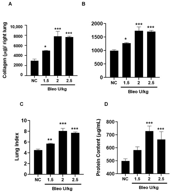 Effects of i.t bleomycin concentrations on lung parameters and vascular leakiness on day 14. Rats were treated with bleomycin, as described in Figure 1. After 14 days, lungs were harvested and BALF obtained. See Materials and Methods. (A) lung collagen content, (B) right lung (wet) weight, (C) lung index, (D) BALF protein content. * p < 0.05; ** p < 0.01; and *** p < 0.001 vs. NC. n = 5 rats/group.