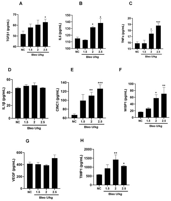 Effects of i.t bleomycin concentrations on BALF profibrotic/ fibrotic meditators on day 14. (A) TGFβ1, (B) IL6, (C) TNFα, (D) IL1β, (E) CINC1, (F) WISP1, (G) VEGF, (H) TIMP1. * p < 0.05; ** p < 0.01; and *** p < 0.001 vs. NC. n = 5 rats/group.