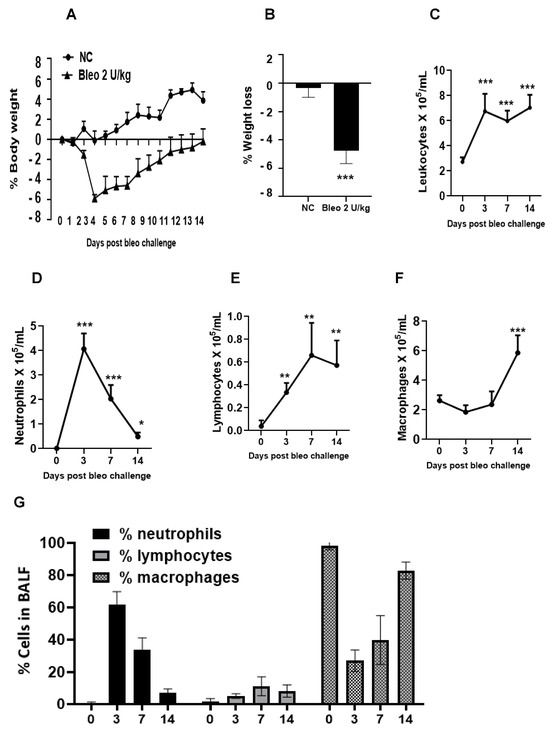 Effects of i.t. bleomycin on clinical signs and pulmonary inflammation on days 3, 7, and 14. (A) % body weight, (B) % avg. body weight loss, (C) total leukocytes, (D) neutrophils, (E) lymphocytes, (F) macrophages, (G) % BALF inflammatory cells. * p < 0.05; ** p < 0.01; and *** p < 0.001 vs. day 0. n = 5 rats/group.