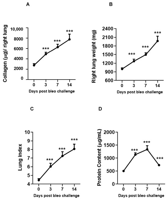 Effects of i.t. bleomycin on lung parameters and vascular leakiness on days 3, 7, and 14. (A) Lung collagen content, (B) right lung weight, (C) lung index, (D) BALF protein content. *** p < 0.001 vs. day 0. n = 5 rats/group.