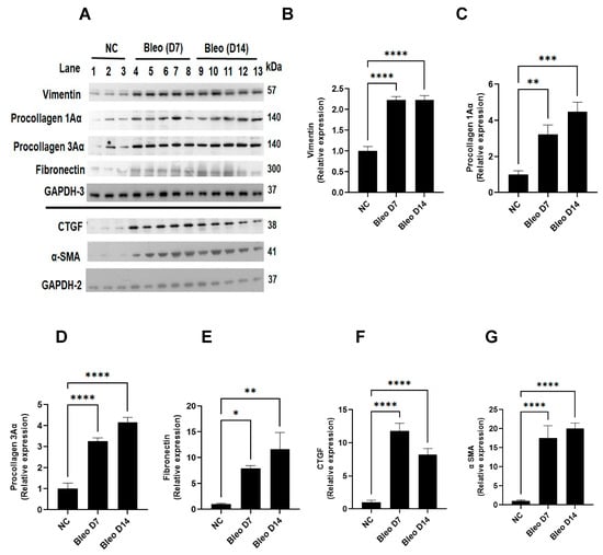 Effects of i.t. bleomycin challenge on the EMT process and ECM components on days 7 and 14. Individual blots were performed for each protein and normalized with the average of 3 GAPDH blots. (A) Protein by Western blots; relative expression of (B) vimentin, (C) procollagen-1Aα, (D) procollagen-3Aα, (E) fibronectin, (F) CTGF, and (G) α-SMA. * p < 0.05; ** p < 0.01; *** p < 0.001 and **** p < 0.0001 vs. NC. n = 5 rats/group.