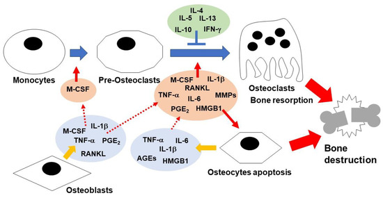 The role of bone cells in inflammatory bone destruction. Several pro-inflammatory cytokines, including TNF-α, IL-1β, and IL-6, promote osteoclastogenesis and osteocyte apoptosis. In contrast, IFN-γ, IL-4, IL-5, IL-10, and IL-13 inhibit osteoclastogenesis.