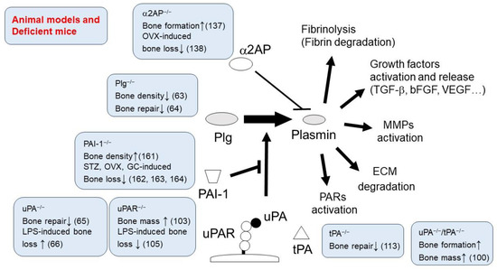 Plg deficiency has been shown to decrease trabecular and cortical bone mineral densities, and the administration of plasmin rescues these effects in mice [63]. Plg deficiency also delays bone repair, leading to decreased bone formation [64]. Additionally, a reduction in the number of osteoblasts and macrophages occurs after the bone becomes defective in mice [65]. Furthermore, Cole et al. have demonstrated that Plg deficiency leads to fibrin deposition within the bone, and this fibrin is associated with inflammation and bone destruction in mice [36]. On the other hand, plasmin has been found to attenuate lipopolysaccharide (LPS)-induced osteoclastogenesis through the PAR-1/AMP-activated protein kinase (AMPK) pathway [66], and it induces OPG production through the ERK1/2 and p38 pathways in osteoblasts [63].