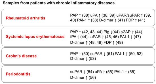 Fibrinolytic factors, including Plg, uPA, uPAR, tPA, α2AP, and PAI-1, have been detected in samples from patients with chronic inflammatory diseases, including rheumatoid arthritis, systemic lupus erythematosus, Crohn’s disease, and periodontitis.