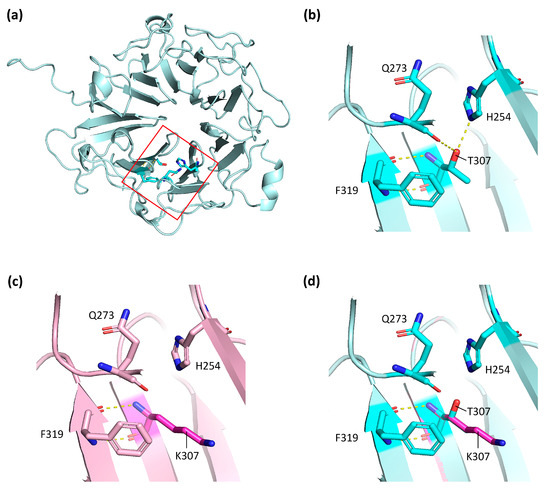 However, T307 residue is evolutionarily conserved (GERP = 5.2699) and the variant causes a decrease in protein stability [I-Mutant, DDG = (−1.05)]. The structural in silico analysis also showed that the mutated protein had lost the hydrogen bonds between the T307 residue and H254 and Q273 positions (Figure 2).