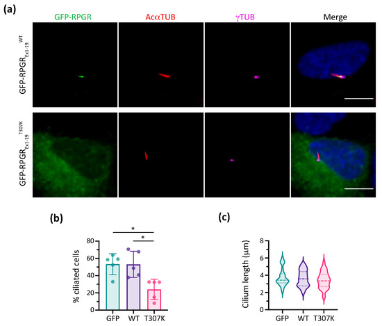 To further confirm the pathogenicity of the p.(Thr307Lys) RPGR variant, in vitro functional studies were performed in hTERT-RPE1 cells using RPGREx1-19 (Figure 3). Remarkably, compared to the localisation of RPGR in the wild-type form (RPGREx1-19WT), the mutated RPGREx1-19T307K did not reach the TZ, resulting in its retention and accumulation in the cytoplasm (Figure 3a). Furthermore, analyses of the RPGREx1-19T307K transfected cells resulted in significantly fewer ciliated cells (approximately 30%) than the empty GFP vector or the RPGREx1-19WT construct (Figure 3b). Nonetheless, the mutant RPGREx1-19T307K expression did not affect the ciliary length compared to the controls (Figure 3c).