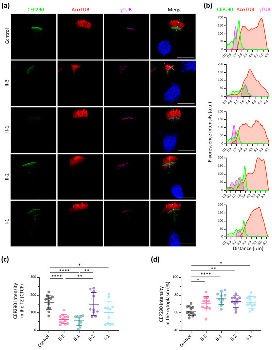 The potential effect of the CEP290 genetic variant in the family was analysed by IF. As reported, CEP290 localised to the TZ in the control. However, it shows an altered distribution in the family members (Figure 5a,b and Figure S3). The CEP290 signal intensity in the TZ was significantly lower in the proband (II-3), brother (II-1) and mother (I-1) compared to the control sample, but no significant differences were observed in the sister (II-2) (Figure 5c). In addition, we detected no significant differences between the proband (II-3) and his brother (II-1) (Figure 5c). The percentage of CEP290 intensity in the cytoplasm showed a significantly higher accumulation in all family members compared to the control (Figure 5d). Similar to the RPGR IF results, the mother (I-1) and sister (II-2) presented as two different populations, even though CEP290 is not located in the X chromosome (Figure S3).