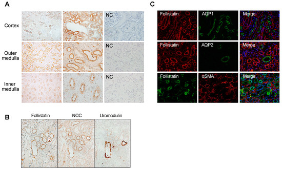 Immunostaining analyses of nephrectomized kidney specimens were conducted to elucidate the subcellular localization of follistatin protein in the normal human kidney. Follistatin was discerned within the renal tubules located in the cortex, outer medulla, and inner medulla (Figure 1A). Subsequent immunostaining using serial sections revealed that follistatin-positive tubules exhibited positivity for uromodulin and NCC (Figure 1B), while concurrently displaying negativity for aquaporin 1 and aquaporin 2 (Figure 1C). These observations suggest that follistatin is synthesized by distal tubules in the normal human kidney.