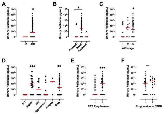 Urinary Follistatin Levels in AKI Patients. (A) Urinary follistatin levels in healthy controls (HC) (n = 16) and AKI patients (n = 118). * p < 0.05 vs. HC. (B) Urinary follistatin levels in patients with prerenal AKI (n = 18), renal AKI (n = 88), and postrenal AKI patients (n = 5). * p < 0.05 vs. prerenal AKI. (C) Urinary follistatin levels and severity of AKI according to KDIGO stage (stages 1–3). * p < 0.05. (D) Urinary follistatin levels for each cause of AKI (sepsis, 20; CIN, 10; hypotension, 11; drug-induced, 27; surgery, 3). CIN, contrast-induced nephropathy, N.D., not detected. ** p < 0.01, *** p < 0.001 vs. HC. (E) Urinary follistatin levels in AKI patients who did (+; n = 58) and did not (-; n = 60) require renal replacement therapy (RRT). *** p < 0.001 vs. RRT (-). (F) Urinary follistatin levels in AKI patients with (+; n = 16) and without (-; n = 42) progression to irreversible ESRD. n.s., not significant. The red line indicates the median.