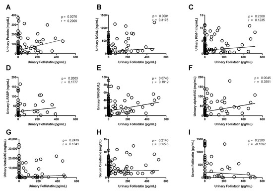 Correlations between Urinary Follistatin and Clinical Parameters. Correlations between urinary follistatin and urinary protein level (A), NGAL (B), KIM-1 (C), L-FABP (D), NAG (E), α1 microglobulin (F), β2 microglobulin (G), serum creatinine (H), and serum follistatin (I) are shown.