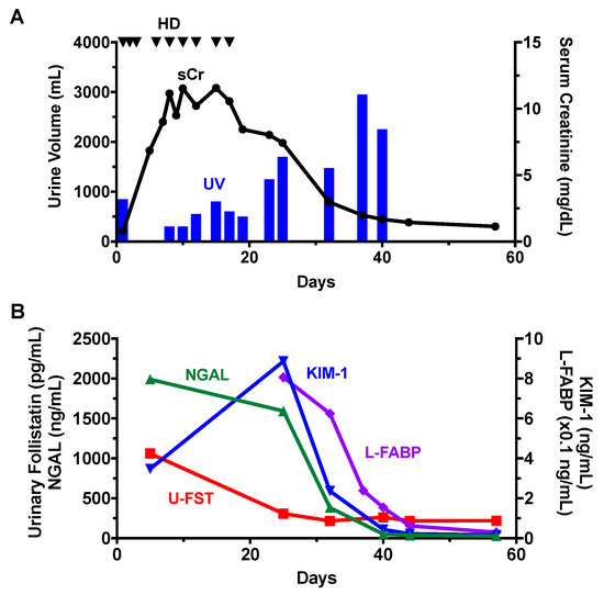 Time Course Changes in Urinary Follistatin and Other AKI Biomarkers. Changes in serum creatinine and urine volume (A) and AKI biomarkers (B) in a patient with drug-induced AKI are shown. Triangle indicates the timing of hemodialysis (HD).