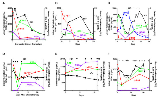 In the present study, we conducted a comparative analysis of the time course changes in urinary follistatin with several biomarkers. Neutrophil gelatinase-associated lipocalin (NGAL), a highly sensitive early biomarker for kidney injury [10], displayed early elevation in conditions such as AKI, diabetic nephropathy, nephrotic syndrome, and obstructive nephropathy [36]. Urinary follistatin exhibited a significant correlation with urinary NGAL (Figure 3B) and displayed a similar trend to urinary NGAL in many cases (Figure 4 and Figure 5A–C,E), suggesting the potential utility of urinary follistatin as an early diagnostic marker for AKI. In humans, urinary NGAL increased not only in AKI, but also in chronic kidney disease (CKD) [37], and is a marker for delayed graft function following kidney transplantation [38], suggesting that the potential of urinary follistatin as a tubular injury marker is not limited to AKI.