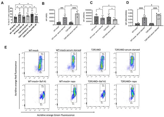 Our previous studies suggest T2R14 is the primary driver of innate immune responses to bacterial infection in GECs [,]. As previously shown, autophagy could be involved in both innate immunity [] and bacterial infection []; therefore, we evaluated the effect of T2R14 expression and activity in autophagy flux in GECs, with oral keratinocyte cells, OKF6 Wt (WT), and OKF6 T2R14 KO (T2R14KO) cells being used as the model system. The autophagic flux was assessed using the Acridine Orange vacuolar assay for detecting acidic vesicular organelles (AVOs), which are the indispensable markers of autophagy [,]. Both cell lines were serum-starved for 72 h to induce autophagy []. The cells were also treated with an autophagy flux inhibitor, Bafilomycin A1 [Baf A1 (10 nM)], and an autophagy flux inducer, rapamycin [Rapa (1000 nM)], for 72 h. The treatment of GECs with Baf A1 and Rapa for 72 h did not lead to any significant change in cell viability (Figure 1A) and flow cytometry analysis of serum-starved GECs did not result in significant cell death. After 72 h, cells were stained with Acridine Orange (final concentration of 1 µg/mL) and incubated at 37 °C for 10 min in the dark. After washing once with PBS, the flow cytometry analysis was performed for evaluating the autophagy flux (Red and Green fluorescence) using the cytoflex flow cytometer []. Acridine Orange staining induces green fluorescence in the cytosolic and nuclear fractions of cells, whereas when it becomes protonated, it emits red intense fluorescence upon fusion with the acidic environment, such as lysosomes. Our results suggested that serum starvation in T2R14KO cells leads to a significant increase in red fluorescence compared to WT (Figure 1B), suggesting more acidic vacuoles in T2R14KO cells. Further, no change in the green fluorescence was observed (Figure 1C). Finally, the red/green fluorescence ratio was also significantly increased under T2R14KO serum-starved conditions compared to the WT serum-starved group (Figure 1D). Further, the treatments of WT and T2R14KO cells with autophagy flux inhibitor Baf A1 leads to the complete loss of red fluorescence (Figure 1E). Baf A1 treatments inhibits vacuolar H(+)-ATPase (V-ATPase), which results in the inability of the lysosome to acidify; thus, no red fluorescence was observed. As expected, autophagy flux inducer Rapa leads to an increase in red fluorescence (Figure 1E).