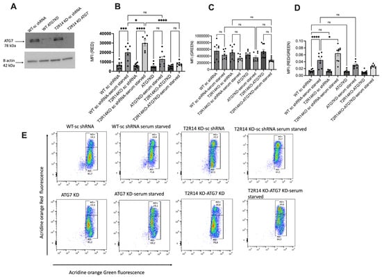 ATG7 is important for the formation of autophagic vesicles and is directly involved in the processing of LC3-I into LC3-II [,]. To check the involvement of ATG7 in autophagosome formation in GECs, ATG7 was knocked down in both WT and T2R14KO GECs using shRNA (Figure 2A). The loss of ATG7 in GECs resulted in non-significant changes in the red fluorescence or ratio of red/green fluorescence (Figure 2B,D). However, we did not observe significant changes in red and red/green fluorescence after Acridine Orange staining in T2R14KO-ATG7KD compared to WT-sc shRNA under serum-starved conditions (Figure 2B–E). This could be due to the ATG7-independent autophagy pathway in GECs. Previous studies suggested that autophagosome formation and autophagy process are independent of ATG7 in different cell types [,].