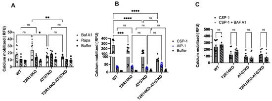 Agonist-induced intracellular calcium mobilization assays were performed, as described previously [,]. WT, T2R14KO, ATG7 KD, and T2R14KO-ATG7KD cells (approx. 30,000/96 wells) were loaded with Fluo-4NW calcium dye, and intracellular calcium response was measured after AIP-1 (50 μM), CSP-1(50 μM) and CSP-1 plus Baf A1 treatment. Intracellular calcium changes were quantitatively measured using a Flex Station® 3 MultiMode Microplate Reader (Molecular Devices, San Jose, CA, USA), with results expressed as alterations in relative fluorescence units (RFUs). Changes in intracellular concentration were recorded using the Flex Station® 3 MultiMode Microplate Reader, with data represented as the change in relative fluorescence unit (RFUs).