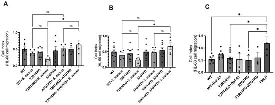 Immune cell (dHL-60) migration. (A,B) Conditioned medium (CM) obtained from with treatments in WT, T2R14KO, ATG7KD, and T2R14KO-ATG7KD cells with or without S. aureus and S. mutans on the migration of differentiated HL-60 cells (dHL-60). The changes in cellular impedance or cell index (CI) were measured every 5 min over 24 h using RTCA software. The bar graph shows change in the migration of dHL-60 cells over a period of 24 h. The bar plots represent the SEM of three independent experiments and were generated using GraphPad PRISM 9.0. Statistical significance was calculated using a one-way ANOVA with Bonferroni’s post hoc test * p < 0.05, and ns denotes non-significant. (C) Effect of conditioned medium (CM) obtained from (with or without BafA1 (10 nM) treatment) WT, T2R14KO, and ATG7KD and T2R14KO-ATG7KD cells on the migration of differentiated HL-60 cells (dHL-60). The changes in cellular impedance or cell index (CI) were measured every 5 min over 24 h using RTCA software. FMLP was included as a positive control for neutrophil chemoattractant. The bar plots represent the SEM of 2–3 independent experiments performed in triplicates. * p < 0.05 showed statistical significance.