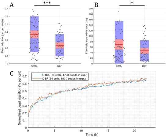 DSF decreased the cell migration and chemokinesis of cDC culture #20231. Phagocytes were enriched by four weeks of cell culture, then treated with DSF 50 nmol·L−1 or DMSO as a vehicle control (0.01% v/v final concentration) at 37 °C and 5% CO2 for 24 h and recorded by video microscopy using the Juli™ Br instrument. Before starting the video recording, cells were incubated with Dynabeads® M-450 Epoxy at a cell to bead ratio of 1:20. (A) DSF decreased the cell migration speed (analyzed by smoothed path, as described in Figure 2b) of phagocytes derived from #20231. (B) DSF decreased the chemokinesis (analyzed by Euclidian distance, as described in Figure 2c) of phagocytes derived from #20231. Blue part of the bar: standard deviation; Red part of the bar: 95% confidence interval; Red line in the middle: mean. (C) DSF did not influence the phagocytosis of cells derived from #20231. Phagocytosis was performed by kinetic analysis for 24 h in a video frame: control (blue line), DSF 50 nM (orange line). Data are visualized as the mean from n = 84 cells from the control group and n = 54 cells from the DSF 50 nM group and evaluated by unpaired t-test (control vs. DSF 50 nM): * p < 0.05, *** p < 0.001. CTRL: Control; DSF: Disulfiram 50 nM.