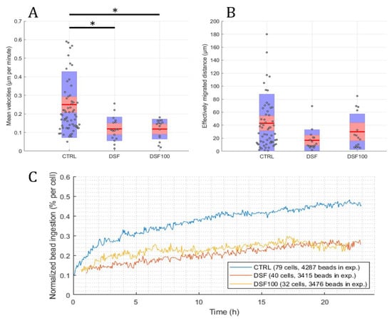 Phagocytosis is a specialized characteristic of phagocytes, as well as tumor cells, within the complex network of cellular immunity. Phagocytosis requires membrane rearrangement and is physiologically mediated by specific receptors []. To explore the effect of DSF on phagocytosis, migration, and chemokinesis of individual phagocytes, we found that DSF downmodulated phagocytosis and migrations, likely due to chemokinesis, in both DC and macrophage subtypes of individual patients. However, DSF-induced cytotoxicity was restricted to phagocytes with high mitochondrial contents and was more constantly found in cultures with macrophages phenotypes (M1, M2a, M2c) but not DC phenotype (Figure 8A,C). Migration velocities and migration paths were also influenced, which may indicate a DSF effect on phagocytes. This effect is likely due to the cytoskeletal network and would also explain the reduced expression densities of CD45 and CD14. However, HL-DR expression was not altered by DSF treatment. Thus, HLA-DR trafficking appears to underlie a different trafficking control when compared to CD45 and CD14. In this study, we applied non-opsonized Dynabeads® M-450 Epoxy to monitor and quantify ingestion by phagocytes. Consecutively, rapid ingestion of Dynabeads® M-450 Epoxy by the majority of cultured human long-lived phagocytes can be observed. Nevertheless, the hydrophobic residues of Dynabeads® M-450 Epoxy can bind to amino residues of proteins, which may cause a high affinity for cell membrane components, such as cholesterol and phospholipids, in the culture medium at neutral pH []. On the other hand, Gu and colleagues found that the inhibitory effect of serum on non-opsonized particle uptake was determined by the negatively charged serum glycoproteins [], which constitute the main proportion of serum nutrients derived from bovine sources []. Since our culture conditions included 10% fetal calf serum, we also performed Dynabead phagocytosis experiments in the absence of fetal calf serum and in the presence of cyclodextrin, which should scavenge phospholipids for opsonization in serum-containing medium. Results showed that in the absence of serum, phagocytosis for Dynabeads by phagocytes was decreased (Supplementary Figure S4).