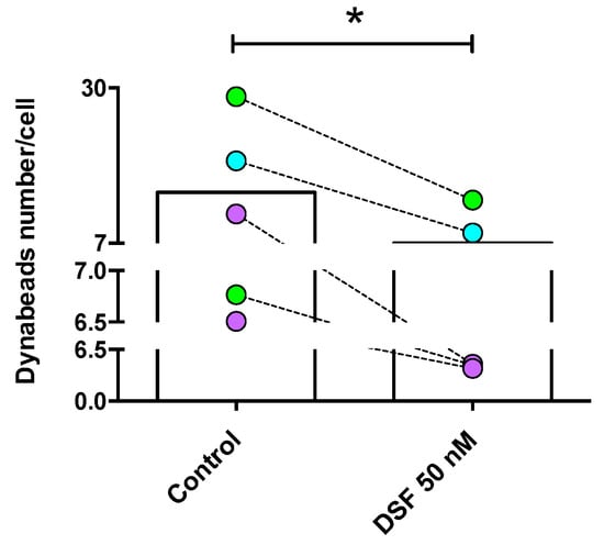 Various drugs in clinical use influence macrophage function, viability, phagocytosis, and migration [,]. Disulfiram (DSF) is a well-established drug used to treat alcoholism by inhibiting aldehyde dehydrogenase (ALDH) []. Moreover, DSF has been considered an anti-cancer agent by blocking the NF-kB pathway, increasing reactive oxygen species (ROS) formation, and inducing subsequent apoptosis in several types of human cancer []. In vitro studies have shown that DSF derivatives chelate zinc and copper [], which explains their cytotoxicity to tumors. This property may also inhibit macrophage phagocytosis []. At the subcellular level, DSF affects mitochondrial membrane potential, depletes glutathione levels, oxidizes NAD(P)H, and inhibits oxidative phosphorylation []. Particles phagocytosed by macrophages are generally categorized as being opsonized or non-opsonized []. The uptake of opsonized particles, such as IgG-coated and complement (iC3b fragment)-coated particles [], is considered conventional phagocytosis. In contrast, the uptake of non-opsonized particles, such as environmental dust, quartz, silica, and uncoated latex beads [,,] follows the same requirements as the engulfment of Dynabeads® M-450 Epoxy employed in this study.
