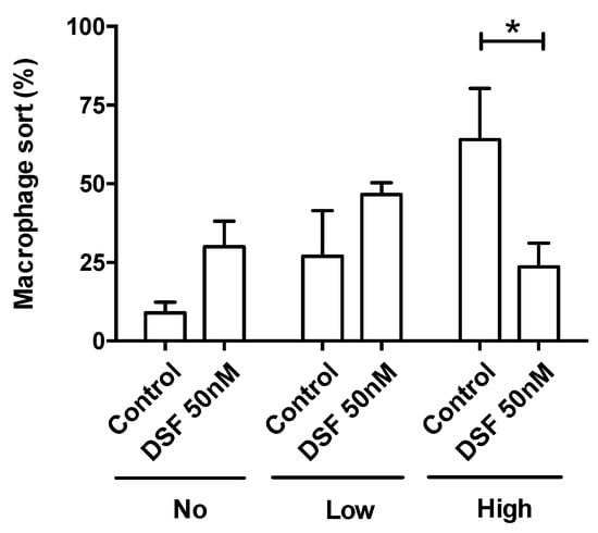 DSF decreased the rate of phagocytes with high phagocytic capacity. Phagocytosis was classified by the number of engulfed beads: (1) 0 beads, no capacity (No. of x-axis); (2) 1–10 beads, low capacity (Low of x-axis); and (3) >10 beads, high capacity (High of x-axis). Data are visualized as the mean ± SEM from n = 5, the same phagocyte cultures as Figure 4 (#20315, #20331, #20725, #21161, #21164) and evaluated by unpaired t-test (control vs. DSF): * p < 0.05.