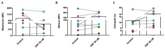 DSF-induced cell death by mitochondrial oxidative stress in macrophages but not in dendritic cells. Phagocytes were cultured for 3–4 weeks, then treated with DSF 50 nmol·L−1 or DMSO as a vehicle control (0.01% v/v final concentration) for 24 h at 37 °C and 5% CO2. Cells were analyzed by flow cytometry and mean fluorescence intensity (MFI) was quantified for mitochondrial mass of phagocytes detected by Mitotracker staining (A), mitochondrial ROS of phagocytes detected by Mitosox staining (B), and the percentage of dead cells were determined by PI staining (C). Phagocytes were identified as cDC from a CFS and an MDD patient (light-green symbols), iDC from an MND patient (turquoise-filled symbols), M1 macrophages from a healthy donor (grey-filled symbols), M2a macrophages from three patients with COVID, post-Vac, and long-COVID (purple-filled symbols), and M2c macrophages from another long-COVID patient (roseo-filled symbol). Accordingly, three macrophage cultures with an M2a phenotype and one with an M1 phenotype responded with increased mitochondrial ROS and cell death, whereas the mitochondrial ROS and viability of dendritic cells (iDC and cDC) were not significantly affected by DSF. cDC: conventional dendritic cells; iDC: immature dendritic cells; CFS: chronic fatigue syndrome; COVID-19: coronavirus disease; MDD: major depressive disorder; MND: motor neuron disease; VAC: vaccine.
