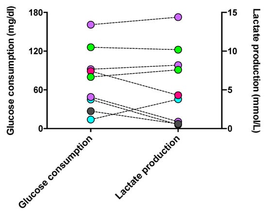 Since phagocytes’ polarization and activities are specifically determined by their metabolic processes, we evaluated the glycolytic level of long-lived phagocytes. Glucose, the fuel consumed in glycolysis, and lactate, the inevitable end product of glycolysis, were assessed. As shown in Figure 9, the level of glucose consumption was approximately proportional to that of lactate generation in each cell culture. However, one macrophage culture with M2a #20373 and cDC #21163 unexpectedly showed the highest consumption of glucose and production of lactate when compared with M1 and iDC phenotypes. Accordingly, the phenotypes of cultured phagocytes were not strictly reflected by the levels of indicative metabolism involved in phenotypic phagocytes, which might be impacted by the in vivo activated immune response, e.g., the micromilieu of COVID-19.