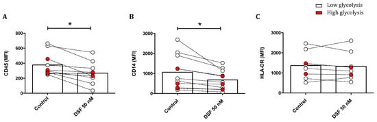 Modulation of surface antigens in phagocyte cultures differing in their glycolytic profile by DSF. Phagocytes were cultured for 3–4 weeks and treated with DSF 50 nmol·L−1 or DMSO as a vehicle control (0.01% v/v final concentration) for 24 h at 37 °C and 5% CO2. The mean fluorescence intensity (MFI) of leukocyte common antigen CD45 (A), monocyte–macrophage lineage marker CD14 (B), and MHC class II cell surface receptor HLA-DR (C) was examined using flow cytometry. The expression of CD45 and CD14 of general phagocytes especially in cells with metabolically low glycolysis was significantly decreased by DSF. Open circles signify phagocytes with low lactate metabolism; red-filled circles signify phagocytes with high lactate metabolism. Data are visualized as the mean from n ≥ 8 phagocyte cultures and evaluated by unpaired t-test (control vs. DSF 50 nM): * p < 0.05.