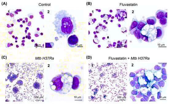 Changes undergone by macrophages of PBMCs under the different incubation conditions. (A) Macrophages in untreated PBMCs (control) show small vacuoles (1). A macrophage from this condition is shown in detail (2). (B) Fluvastatin treatment of PBMCs induces a generalized conversion of monocytes/macrophages to highly vacuolated cells, similar to conventional foamy macrophages, here referred to as FFM (1). Note how these macrophages tightly attach to several monocytes and/or lymphocytes (2). (C) In the absence of fluvastatin, inactivated Mtb H37Ra induces in PBMCs the formation of granuloma-like structures (GLSs) (1) and transforms a few macrophages into foamy cells similar to FFMs (2). (D) In fluvastatin-treated cultures, the exposition to Mtb H37Ra induces cellular aggregates rather than compact GLSs (1). These aggregates are mainly formed by FFMs (2). Cells were stained with May–Grünwald Giemsa solutions and analyzed by optical microscopy.