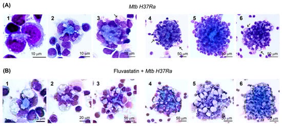 Effect of fluvastatin in the time course response of PBMCs to inactivated Mtb H37Ra exposition. (A) In cultures only exposed to the bacteria, during the first hour of incubation, two or a few macrophages initiate the formation of granuloma-like structures (GLSs) by surrounding small amorphous masses (1,2). In the following three hours, these masses progressively grow and appear encircled by some broken nuclei and by a few new recruited macrophages (3). Thereafter, many more macrophages enclosed these amorphous formations in compact GLSs (4,5). Note that some FMs are also incorporated (arrows in (3,4)). Many more macrophages are progressively incorporated to the structures, which continue growing until the end of the incubation (5). At this time, most GLSs are highly compacted, intensely stained and scarcely contain FM; however, a few GLSs are less compacted, enclose a smaller core, and incorporate more FMs (arrows in (6)). (B) Similarly, in fluvastatin-treated cultures exposed to inactivated Mtb H37Ra, two or more FFMs are surrounded by an amorphous mass during the first hour of incubation, but they evolve into small cores surrounded by numerous vacuolated macrophages (1–3). Later, more FFMs surround them (4,5), forming small non-compacted cell aggregates (compare (B5,A5)). Occasionally, some aggregates have large central cores and fewer FFMs (6). Cells were stained with May–Grünwald-Giemsa solutions and analyzed by optical microscopy.