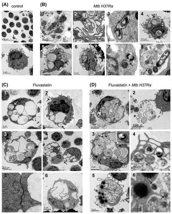 FFMs resulting from fluvastatin treatment had numerous large vacuoles (Figure 3(C1)), and emitted short membrane protrusions that engulfed non-identifiable material from their surrounding microenvironment (Figure 3(C2)). However, as in this condition immune debris was barely generated, and most macrophages were able to remove it, their vacuoles scarcely contained detritus and were apparently empty. A few of these FFMs contained vesicular organelles within their vacuoles (Figure 3(C3)) such as those shown in Figure 3(B8). We appreciated a tight association between the cytoplasmic membranes of FMs and their attached cells (Figure 3(C4,C5)). Another feature of these macrophages was that they frequently subdivided vacuoles by emitting filopodia-like projections (Figure 3(C6)). In fluvastatin-treated cultures that were exposed to the bacteria, FFMs were not converted to epithelioid cells and only emitted small membrane protrusions. These activated FFMs showed few vacuoles and their cytoplasm was filled with debris and a high number of vesicular organelles, both intermingled with filopodia-like projections (Figure 3(D1)). Similar organelles were present at the periphery of these macrophages (Figure 3(D2)). Like FMs, these FFMs captured some bacteria in phagosomes (Figure 3(D3)) and engulfed others along with debris through a similar phagocytic process, but delivered them into a cytoplasm filled with organelles that could degrade them (Figure 3(D3,D4)). Supporting this possibility, preserved bacterial cells were infrequently visualized in these cells, although their cytoplasm contained dark spots that, due to their morphology and size, could correspond to partially digested bacteria (Figure 3(D5,D6)). Many of these cells presented numerous lipid bodies (Figure 3(D5)) similar to those observed in macrophages infected with the bacillus of Calmette–Guerin [51].
