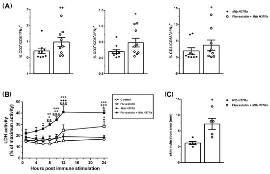 Fluvastatin exacerbates the cellular response against Mtb H37Ra. (A) Percentage of CD3+CD8−, CD3+CD8+ and CD3−CD56+ cells that produce IFNγ in untreated (black circles) or fluvastatin-treated PBMCs exposed to Mtb H37Ra (open circles). (B) Time-course of LDH activity in culture media. Note the significant increase in cytotoxicity promoted by fluvastatin in cells exposed to Mtb H37Ra. (C) Response to tuberculin test in rabbits immunized with Mtb H37Ra that previously received fluvastatin (open circles) or vehicle (black circles). Results in (A,B) represent the mean ± SE of 9 (A), or 5 (B) independent experiments. * p ≤ 0.05, ** p ≤ 0.01, *** p ≤ 0.001 vs. control; + p ≤ 0.05, ++ p ≤ 0.01, +++ p ≤ 0.001 vs. Mtb H37Ra; & p ≤ 0.05, && p ≤ 0.01, &&& p ≤ 0.001 vs. fluvastatin (Two-way ANOVA followed by Neuman–Keuls test). In (C), results represent the mean ± SEM of 5 rabbits for each experimental condition. + p ≤ 0.05, ++ p ≤ 0.01 vs. Mtb H37Ra (paired t-test).