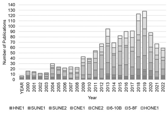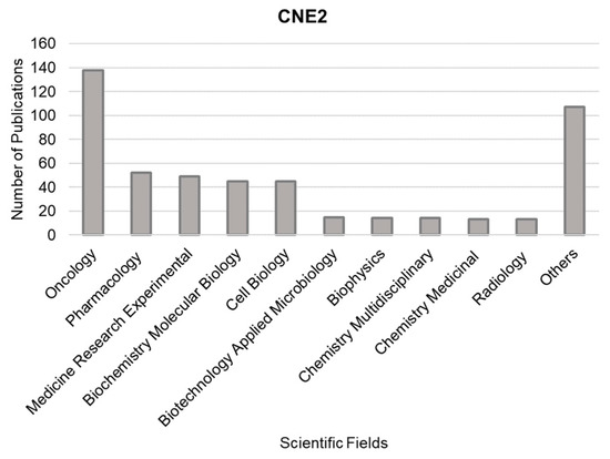 This analysis covers scientific fields featured in articles that utilize the CNE2 cell line, as well as the distribution of these fields in articles published between 2000 and 2023. The data were derived from the Web of Science [73]. Only papers with the term “CNE2” and not “CNE-2” were considered in this analysis.