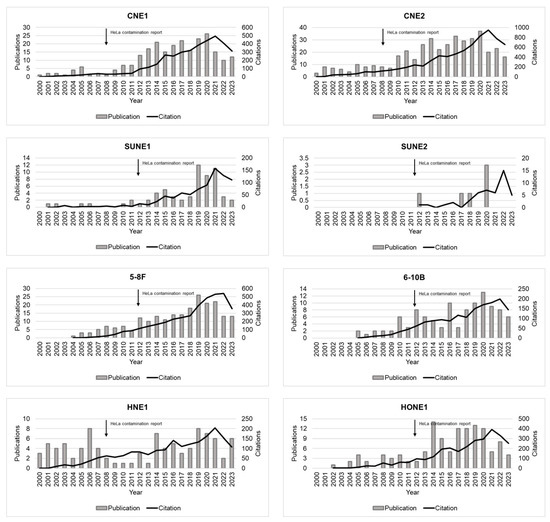 A concerning fact is that the number of publications and citations of misidentified NPC cell lines continued to increase even after the official announcement that NPC cell lines were contaminated with HeLa cell lines [31,54]. To better understand this issue, we examined information for the CNE2 cell line. This line is one of the most commonly used NPC cell lines identified as HeLa-contaminated. CNE2 is a poorly differentiated NPC epithelial cell line that originated from a primary tumor biopsy in China in 1983 [24]. Since most NPCs are poorly differentiated, the CNE2 cell line has been a crucial model for nasopharyngeal studies. A search on the “Web of Science” database using the terms “CNE2” and “nasopharyngeal carcinoma” yielded 416 articles focusing on the CNE2 cell line from 1983 to 2023. This cell line was identified as HeLa-contaminated in 2008 [31]. From 2008 to 2023, this cell line was mentioned in 361 articles. Furthermore, these articles were cited in an additional 5271 articles, including 132 articles with self-citations. Almost all articles did not provide an authentication test. For many decades, CNE2 has been a fundamental tool in various fields of biomedical research. Numerous grants have been allocated and significant progress has been made in understanding disease etiology and developing treatments and cures.