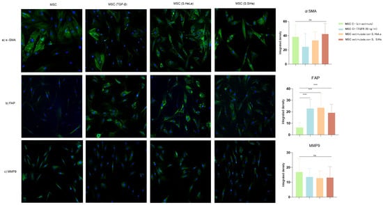 Expression of αSMA, FAP, and MMP9 in MSC cells unstimulated and stimulated with supernatant from SiHa and HeLa cells. The αSMA, FAP, and MMP9 expression were evaluated through immunofluorescence using an FITC-conjugated, Alexa488-conjugated secondary antibody (green) and nuclear staining with DAPI (blue). Merged images are shown at 10× magnification. (a) Expression of αSMA in MSC cells; (b) Expression of FAP in MSC cells; (c) Expression of MMP9. Differences were found in FAP in the groups: MSC C− vs. MSC + (TGFβ), MSC stimulated with S. HeLa, MSC stimulated with S. SiHa. Three independent experiments were performed. Statistical analysis was performed using one-way ANOVA. Data are presented as mean ± SD, **** p < 0.0001, ns: non-significant followed by a Tukey test. MSC C−: MSC unstimulated (basal), MSC C+: stimulated with TGFβ (20 ng/mL), MSC stimulated with S. HeLa: MSC stimulated with supernatant from HeLa, MSC stimulated with S. SiHa: MSC stimulated with supernatant from SiHa.