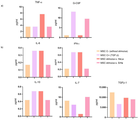 Cytokine production in MSC cells stimulated with HeLa and SiHa supernatants. (a) recruitment cytokines (TNF-α, G-CSF); (b) polarization cytokines IL-6, IFN-γ, IL-10, IL-7, and TGF-β1 using a multiplex immunoassay. The results of an independent assay are presented in pg/mL for each cytokine: MSC: MSC unstimulated (basal), MSC +: stimulated with TGFβ (20 ng/mL), MSC stimulated with S. HeLa: MSC stimulated with supernatant from HeLa, MSC stimulated with S. SiHa: MSC stimulated with supernatant from SiHa.