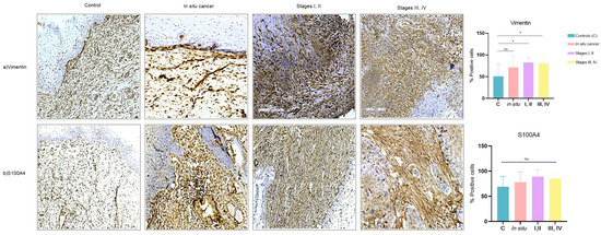 Representatives images of expression of vimentin and S100A4 in cervical tissues from controls (cervix without CC), in situ cancer, stages I, II (CC I, II), Stages III, IV (CC III, IV). (a) vimentin, (b) S100A4, were detected by automated immunohistochemistry (IHQa); brown staining indicates positive expression. Statistical analysis was performed in % positive cells using one-way ANOVA in five fields. Data are presented as mean ± SD. * p < 0.05, ns: non-significant followed by a Tukey test. Each of the panels are representative photomicrographs of five fields (200 microns).