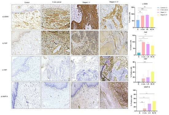 Representatives images of expression of αSMA, FAP, ki-67, and MMP9 in cervical tissues from controls (cervix without CC), in situ cancer, stages I, II (CC I, II), stages III, IV (CC III, IV). (a) αSMA, (b) FAP, (c) KI67, and (d) MMP9 were detected by automated immunohistochemistry (IHQa); brown staining indicates positive expression. Statistical analysis was performed in % positive cells using one-way ANOVA in five fields. Data are presented as mean ± SD. * p < 0.05, ** p < 0.05, **** p < 0.0001, *** p < 0.0001, ns: non-significant followed by a Tukey test. Each of the panels are representative photomicrographs of five fields (200 microns).