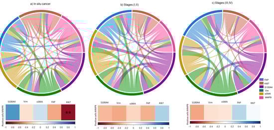 Correlogram between vimentin, S100, αSMA, FAP, MMP9, and Ki67 in samples with CC. The upper section displays a chord diagram, where each protein is represented by a different color, visually depicting their relationships in each stage. **p < 0.05; The thickness of the chord indicates the strength of the association between proteins. The lower section shows a correlation matrix, indicating the relationships between the proteins and the percentage of MMP9-positive cells. Positive correlations are highlighted in blue, while negative correlations are denoted in red. The analysis was performed using Spearman’s correlation in RStudio.