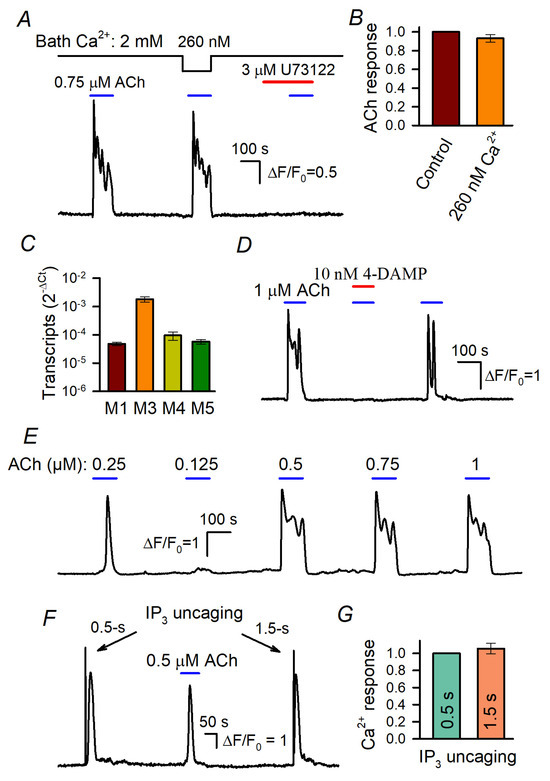 It turned out that the decrease in bath Ca2+ from 2 mM to 260 nM affected cellular responses to ACh insignificantly (Figure 1A,B), thus indicating that IP3-driven Ca2+ release was mostly responsible for ACh-induced Ca2+ signals. The rationale for the abovementioned Ca2+ protocol was that the complete removal of bath Ca2+ with EGTA initiated dramatic rundown of cell responsivity during prolonged recordings. On the other hand, cells tolerated the reduction in extracellular Ca2+ to 260 nM, which proportionally, i.e., by the four orders of magnitude, decreased Ca2+ influx, in fact nullifying its contribution. In addition, the inhibition of PLC with U73122 (3 μM) rendered cells irresponsive to ACh (Figure 1A). These findings indicate that ACh transduction involved primarily muscarinic receptors that were coupled by the phosphoinositide cascade to IP3-driveen Ca2+ release rather than to Ca2+ entry.