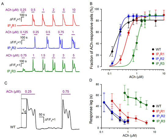 Dose dependencies of agonist responses. (A) Representative Ca2+ responses of individual cells of the IP3R1-HEK (191 cells), IP3R2-HEK (178 cells), and IP3R3-HEK (164 cells), which were serially stimulated by ACh at the indicated concentrations. (B) Fractions of ACh-responsive cells in WT-HEK (256 cells), IP3R1-HEK (191 cells), IP3R2-HEK (178 cells), and IP3R3-HEK (164 cells) populations. The data are presented as mean ± S.D. The straight lines correspond to the approximation of experimental data for WT-HEK-, IP3R1-HEK-, IP3R2-HEK-, and IP3R3-HEK cells with Equation (1) at the following parameters, respectively: F0 = 81, 88, 88, and 89; C0.5 = 0.17, 0.21, 0.41, and 1.01 μM; and n = 2.7, 5.3, 3.4, and 4.2. (C) Representative Ca2+ transients elicited by ACh at 0.25 μM (near-threshold concentration) and 0.75 μM in the same WT-HEK cell. These ACh responses were delayed relative to the moment of agonist application by 52 s and 14 s, respectively. The characteristic time of the response delay (τd) was determined as a time interval necessary for a Ca2+ transient to reach the half-magnitude. (D) Response lag versus agonist concentration (mean ± S.D.). The data were collected from 61, 56, 58, and 49 cells of the WT-HEK, IP3R1-HEK, IP3R2-HEK, and IP3R3-HEK lines, respectively.