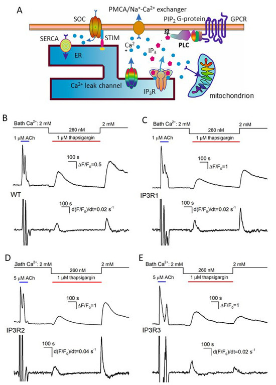 - Thillaiappan, N.B.; Chakraborty, P.; Hasan, G.; Taylor, C.W. IP3 receptors and Ca2+ entry. Biochim. Biophys. Acta Mol. Cell. Res. 2019, 1866, 1092–1100. [Google Scholar] [CrossRef] [PubMed]
