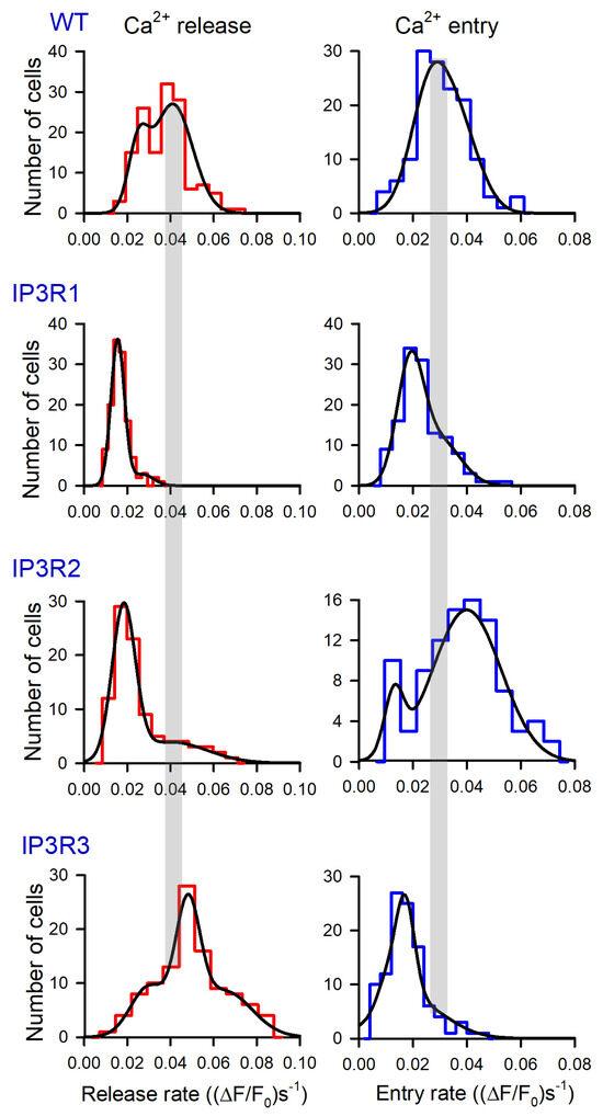 The experimental histograms revealed dissimilarity between WT-, IP3R1-, IP3R2-, and IP3R3-HEK cells in both thapsigargin-induced Ca2+ release and SOCE. In particular, the Rr distributions for WT-HEK and IP3R3-HEK cells were wider and shifted positively compared to the Rr histograms obtained for IP3R1- and IP3R2-HEK cells (Figure 4, left panels). On average, Rr in WT-, IP3R1-, IP3R2-, and IP3R3-HEK cells was 0.037 ± 0.011, 0.017 ± 0.005, 0.026 ± 0.008, and 0.049 ± 0.013 (ΔF/F0)s−1 (mean ± S.D.), respectively. This indicates that Ca2+ leakage in WT- and IP3R3-HEK cells was more intensive than that in IP3R1- and IP3R2-HEK cells.